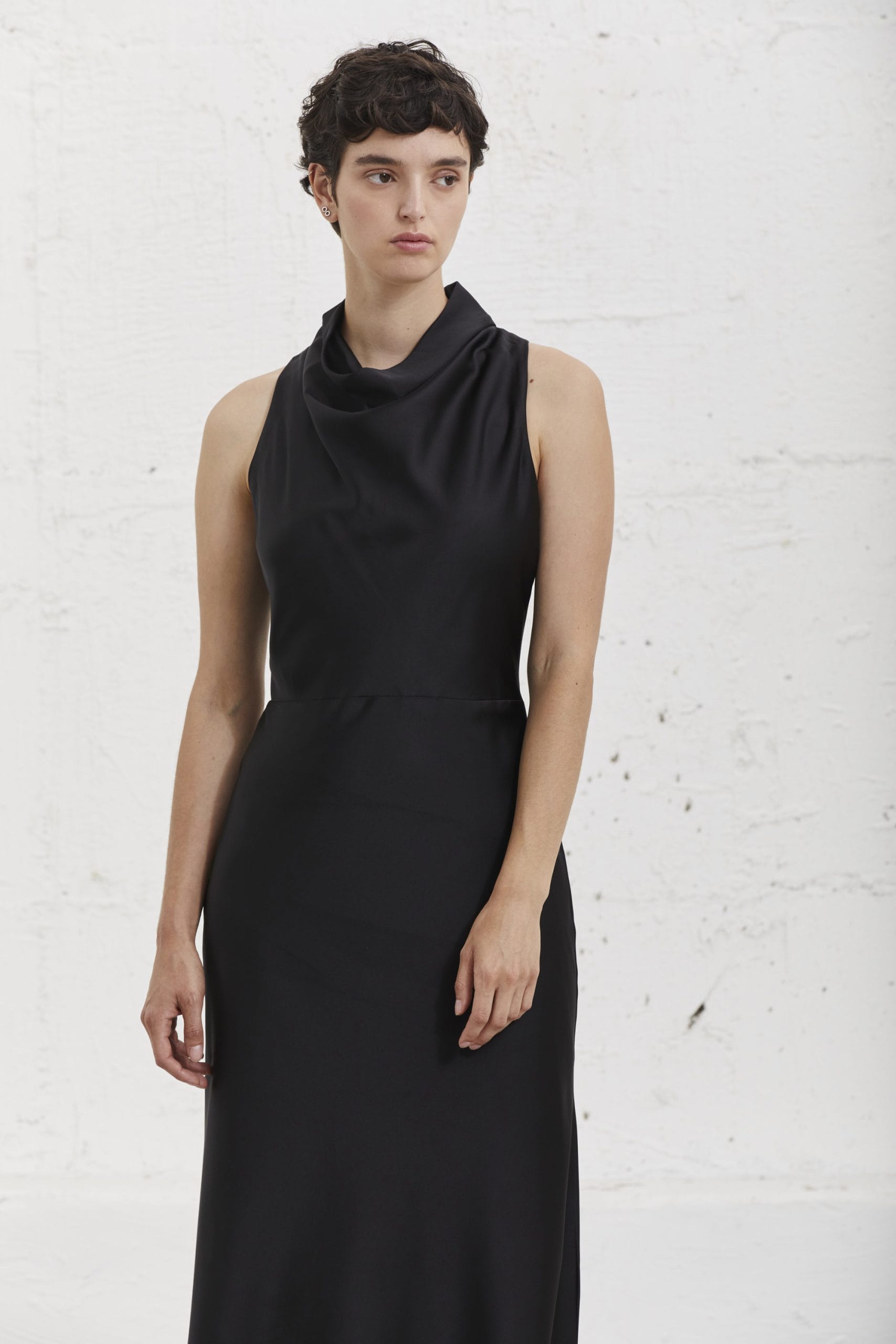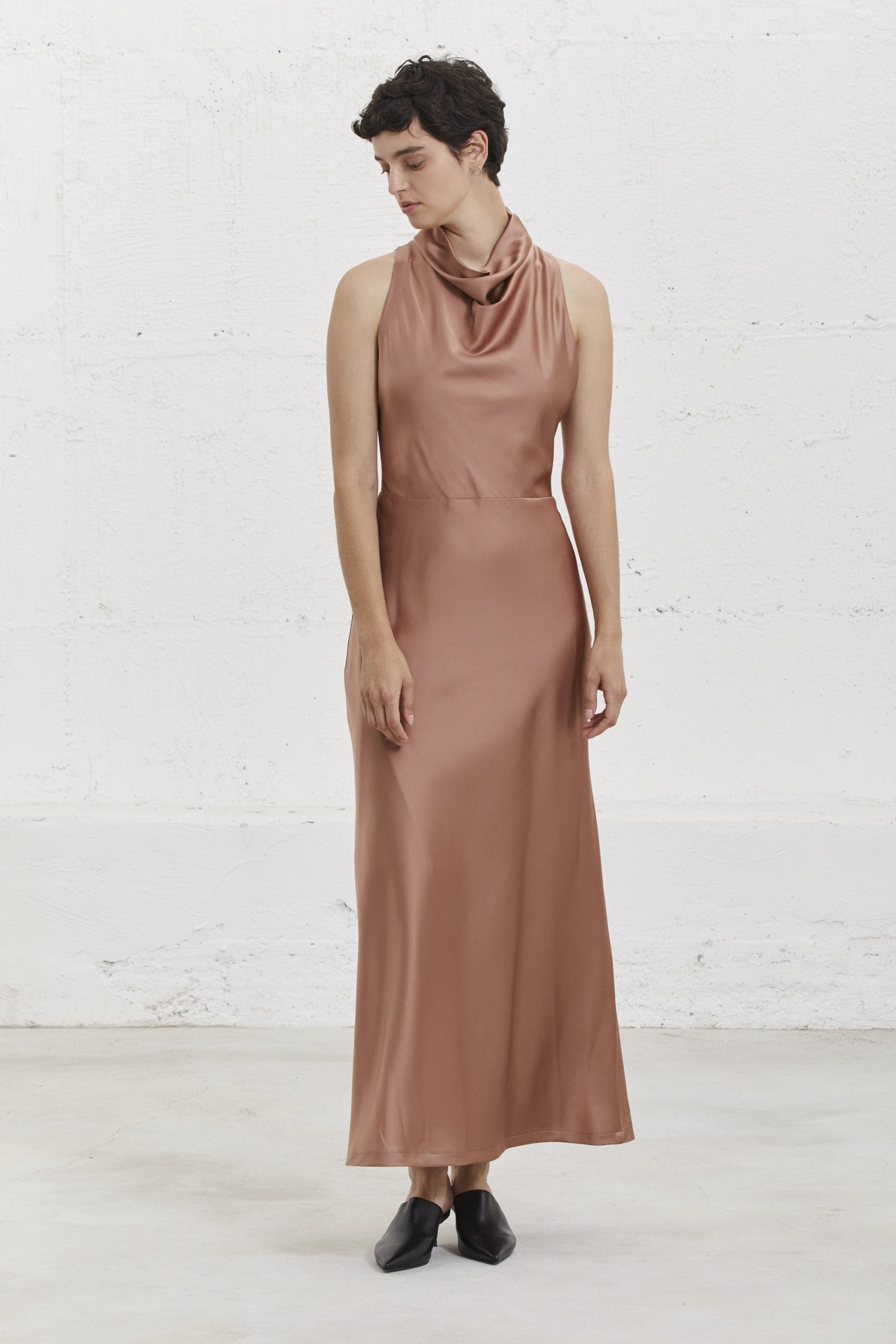 שמלה מקסי אלגנטית, לשעות הערב. יש לה צווארון סגור נשפך, תפר אופקי להדגשת המותן ומחשוף בגב בשילוב סגירת זוג כפתורים.